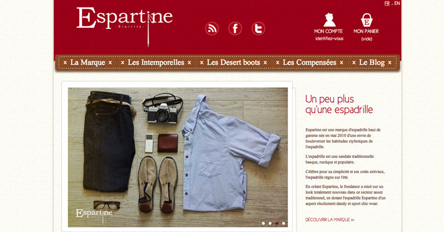 Espartine Nous avons réalisé le site e-commerce d’Espartine sur la solution e-commerce Prestashop. Ce magnifique full design en fera succomber plus d’un à la tentation d’acheter ces magnifiques peaires d’espadrilles.…
